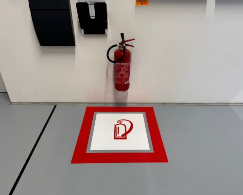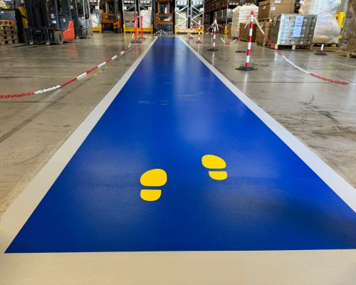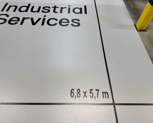 Vyznačenie chodníkov pre peších modrou farbou, označenie hydrantov, hasiace prístroje, texty a logo klienta