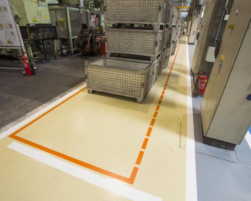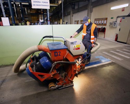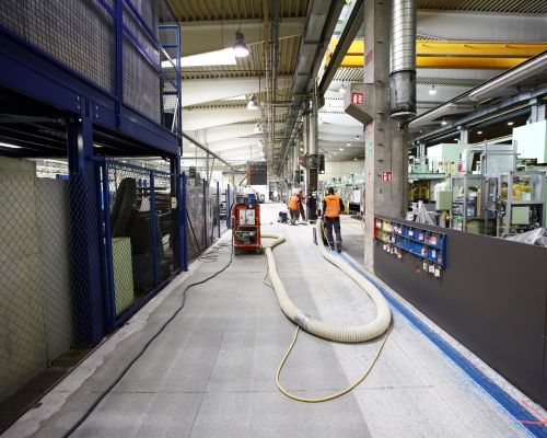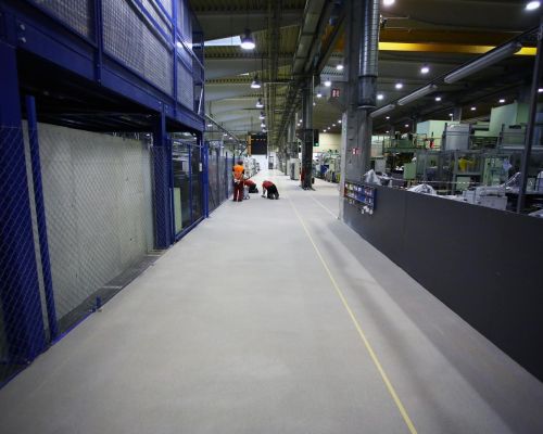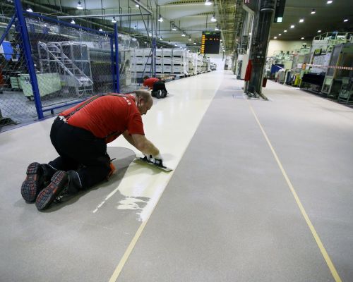 Zadanie: Vykonať v krátkom časovom úseku úplne novú syntetickú podlahu v poriadku tisícov m². Požiadavka na niekoľko farebných úprav a finálne značenia. Na mnohých miestach vysoko degradovaný alebo mastný povrch.