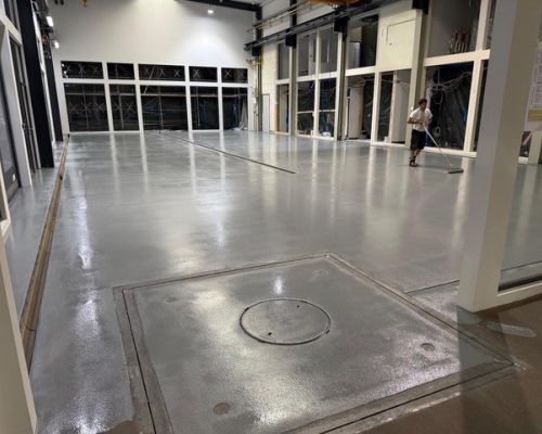 Zo starej betónovej podlahy bolo potrebné vytvoriť úplne nový povrch. Riešením bola epoxidová stierka v protišmykovom prevedení.