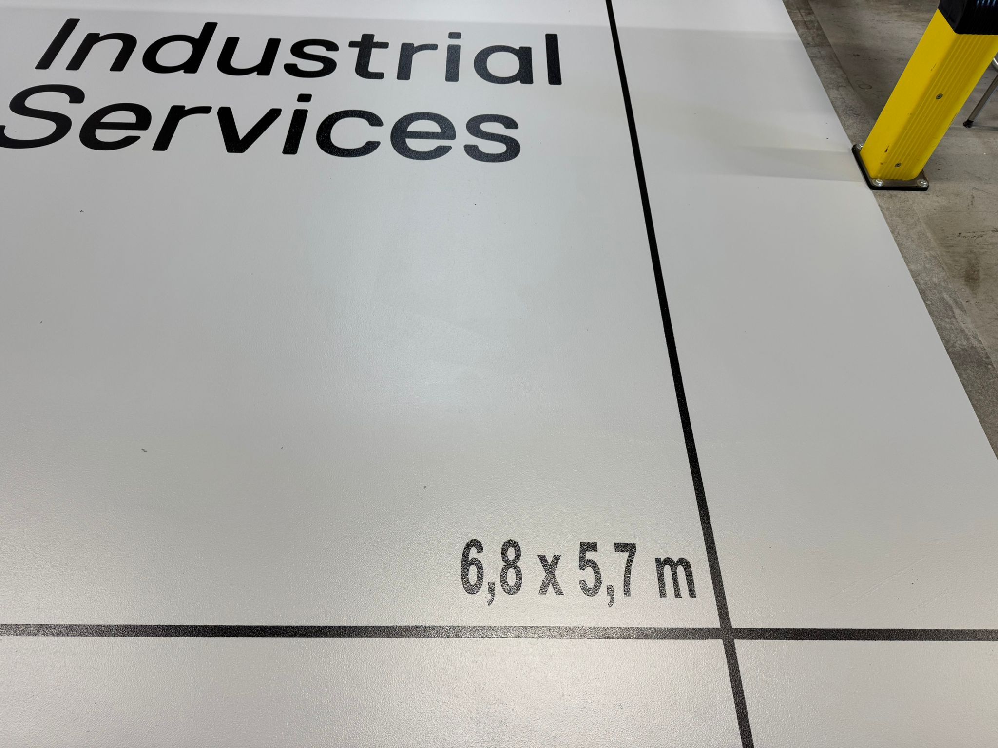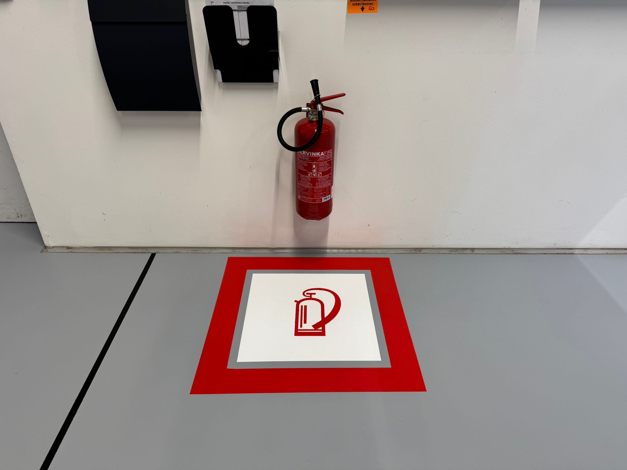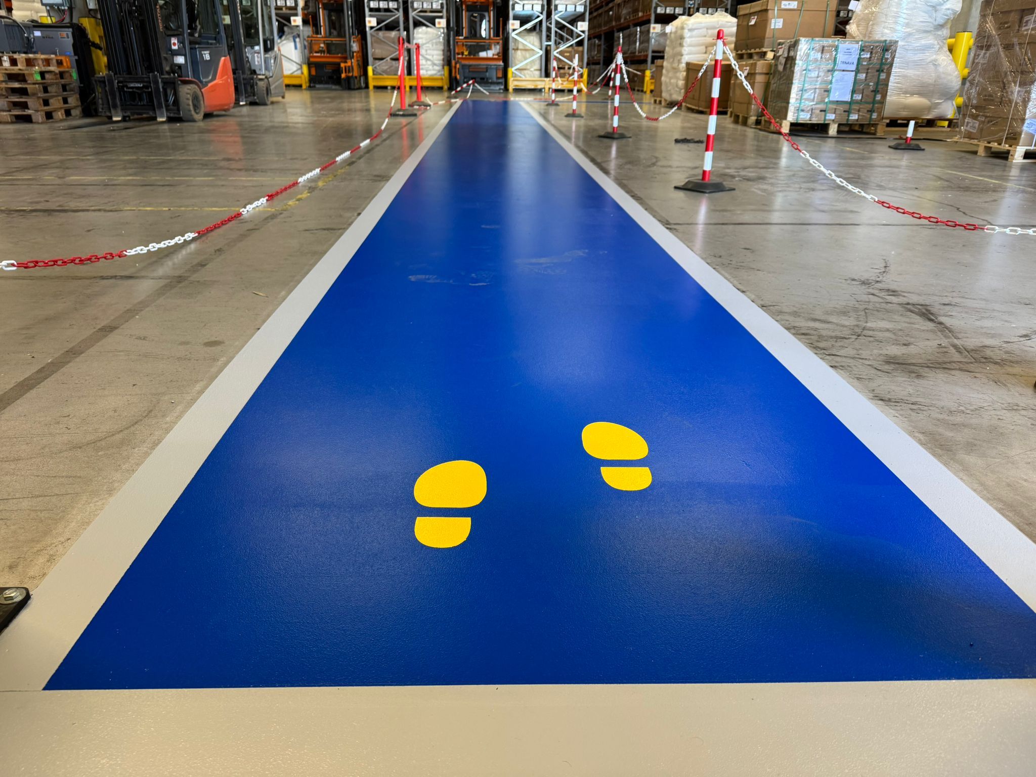 Zadání zákazníka:Vyznačení koridorů pro pěší v modré barvě, značení hydantů, hasicích přístrojů, texty a logo klienta