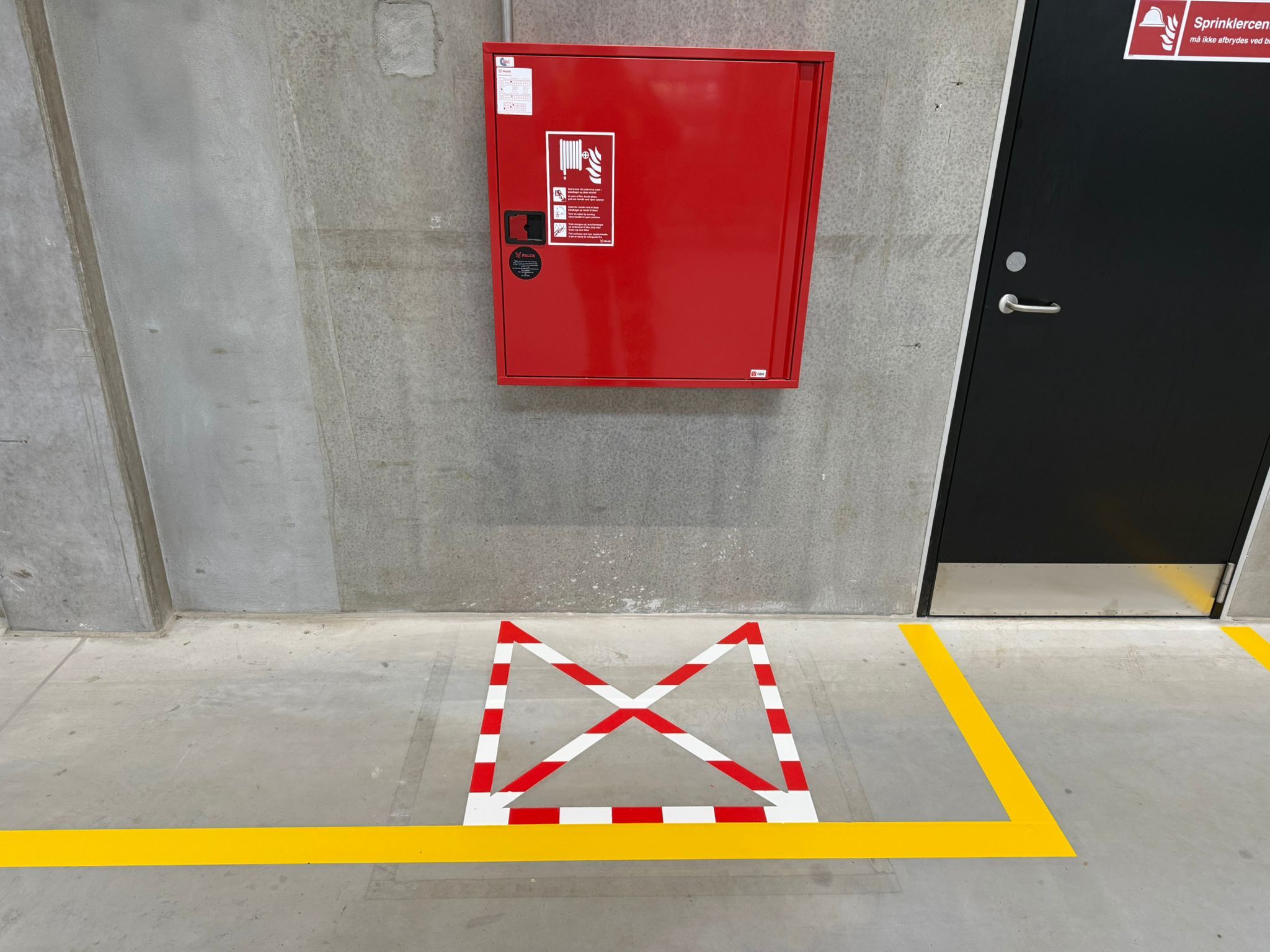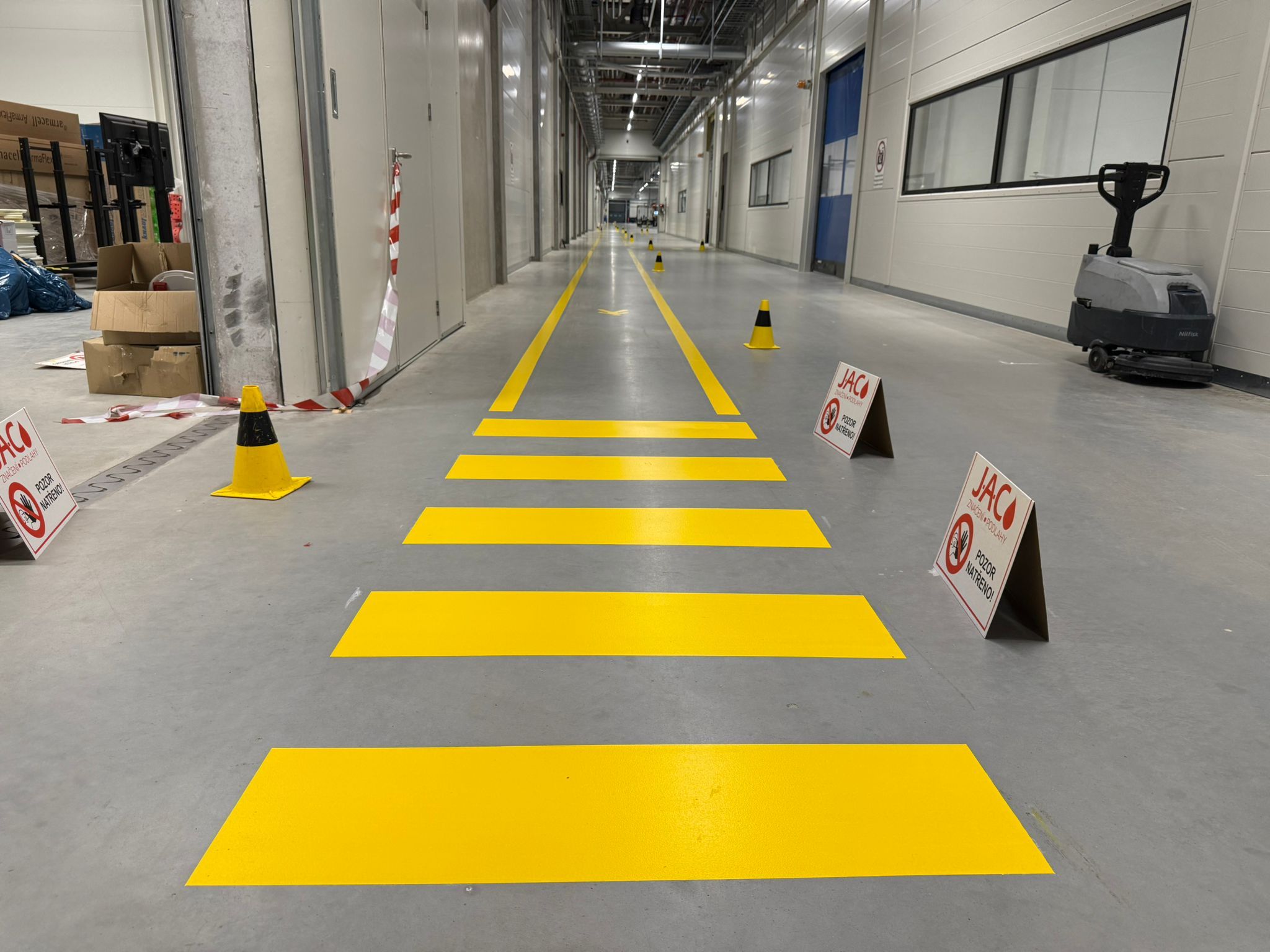 Zadanie zákazníka:Vyznačenie koridorov pre peších v modrej farbe, značenie hydantov, hasiacich prístrojov, texty a logo klienta